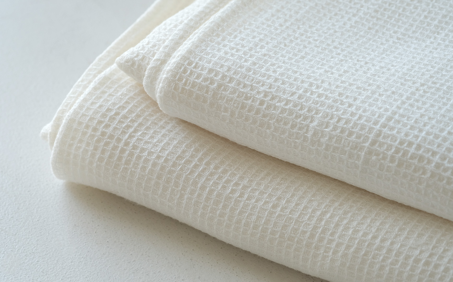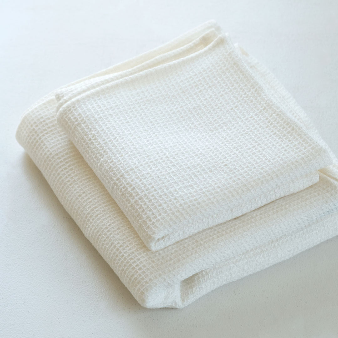 お菓子のワッフルの表面のように、布面に凹凸の升目がある織物のこと。 蜂巣(はちす)織り、ハニカムともいいいます。表面積が広いので水分をしっかり吸収できる、軽く柔らかい織り方です。