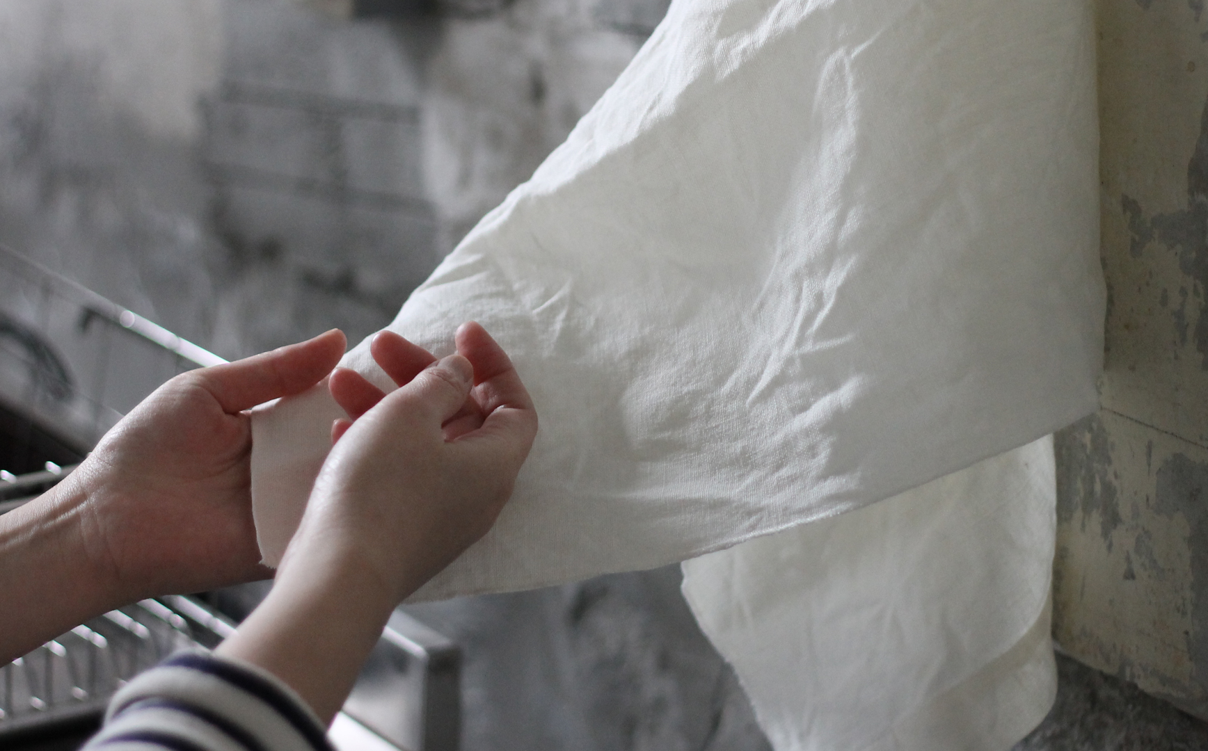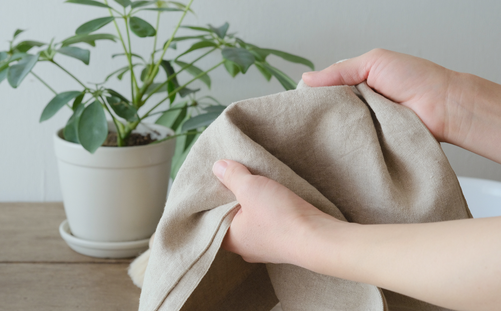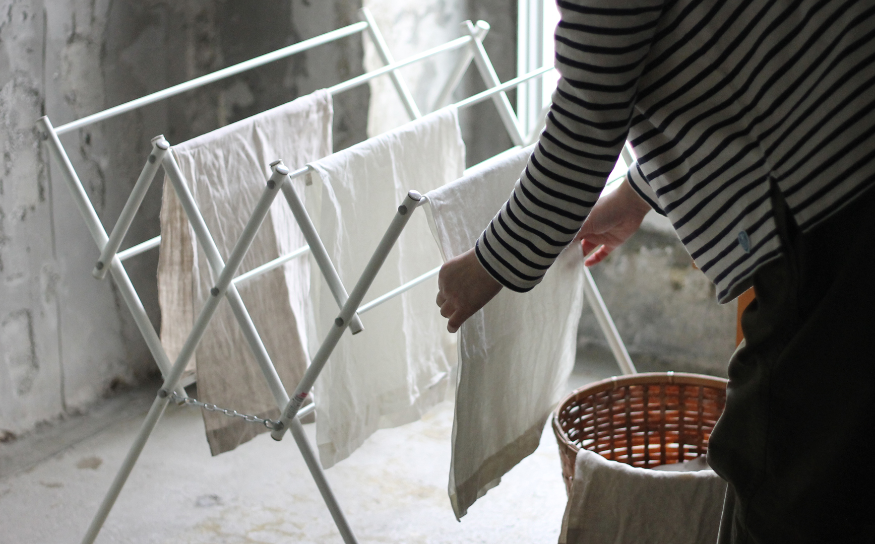 リネンはコットンなど他の繊維に比べ、水分を素早く発散します。繊維の組織に中空構造を持っているからです。そのため吸湿性も高く、水分や汗をすばやく吸い取ります。洗濯物が乾きにくい梅雨時や冬に活躍。