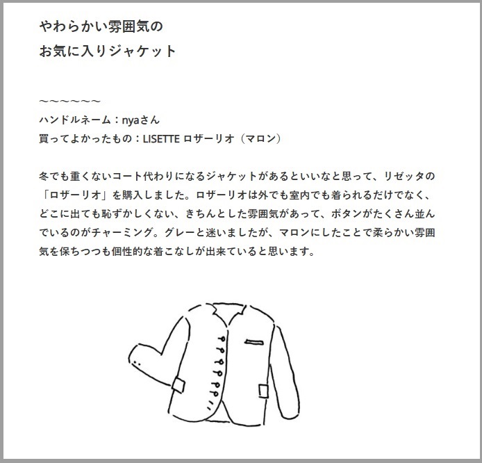 リゼッタのお洋服、リネンバードの生地やキット、毎日の眠りのためのベッドリネン、フリーマンのニットやエルニの下着などなど、エンベロープで購入いただいたものどんなものでもかまいません(私たちが運営しているお店でもありがたいです)。