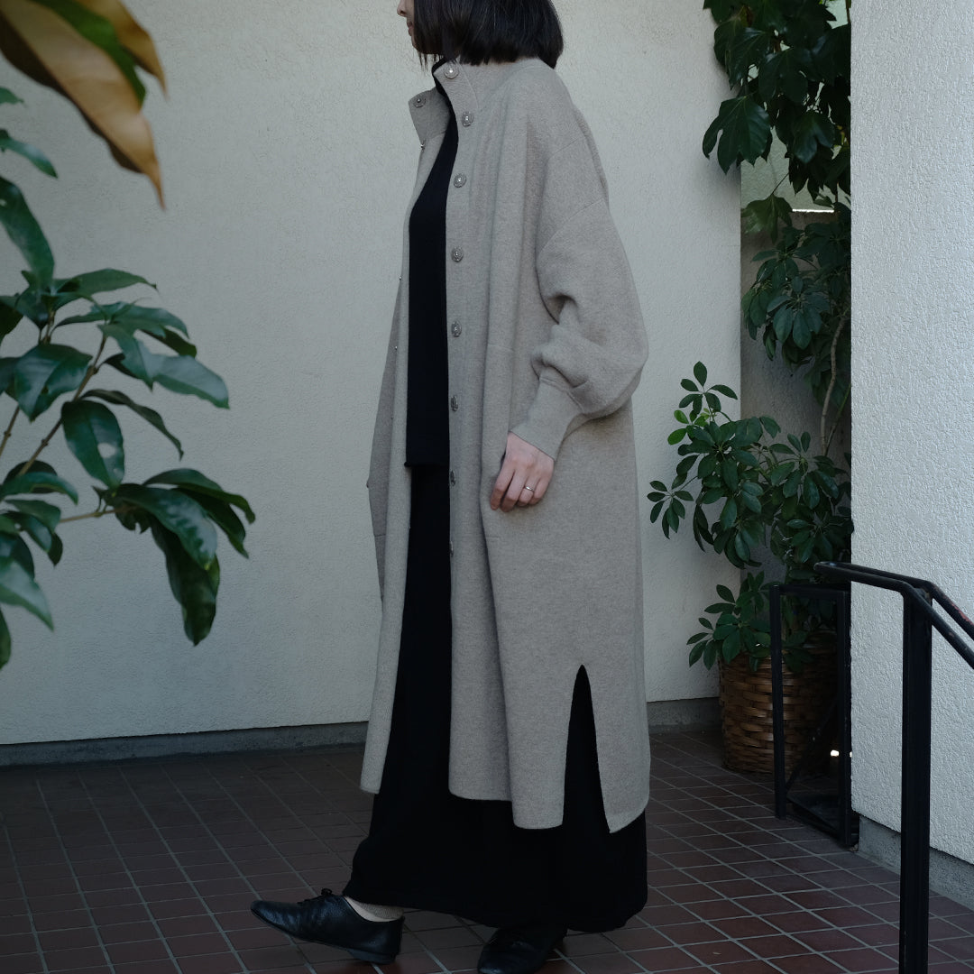 キュッとしぼんだ袖元と首がポイントで全身をたっぷりと覆ってくれるロングコートです。