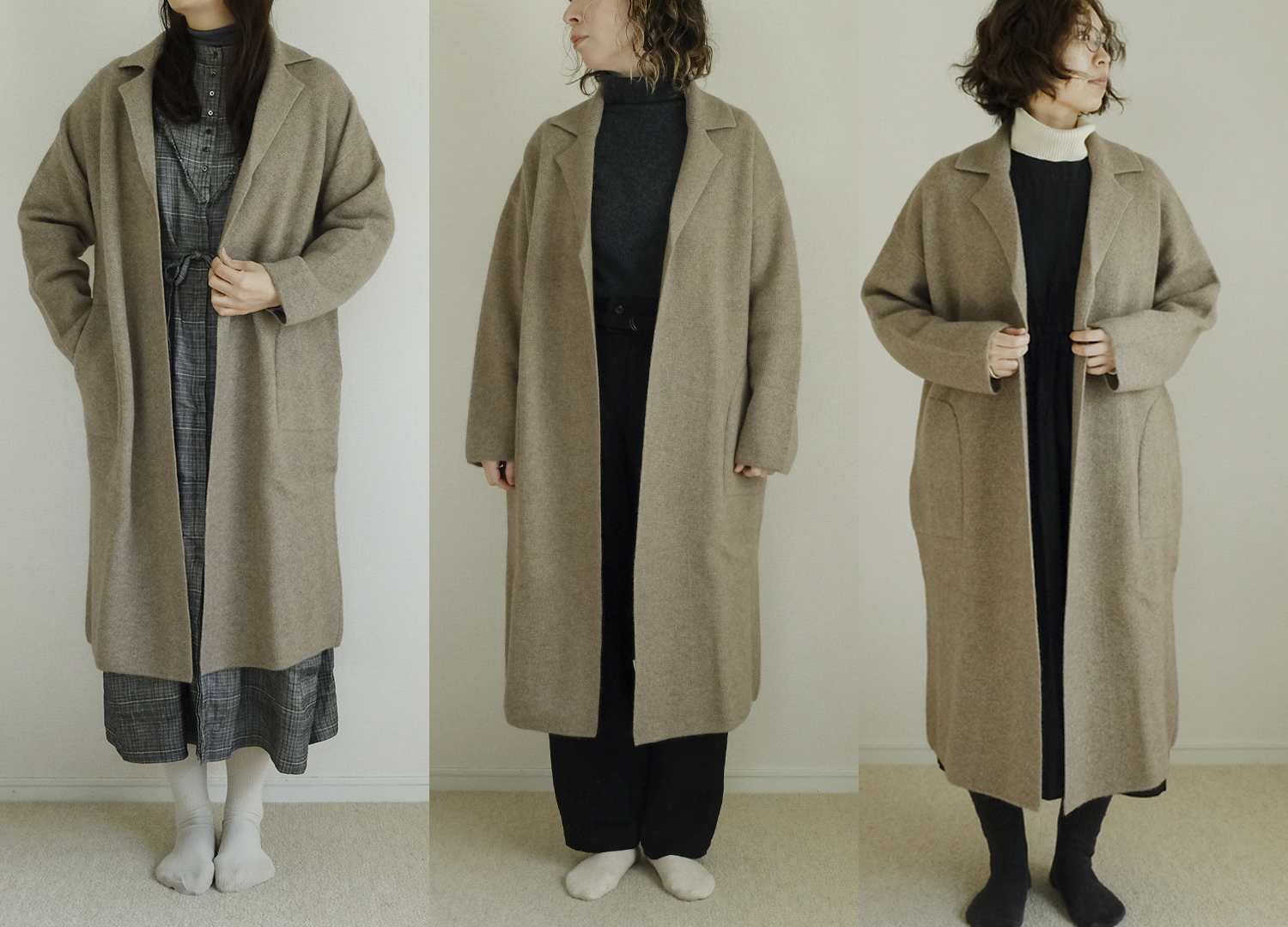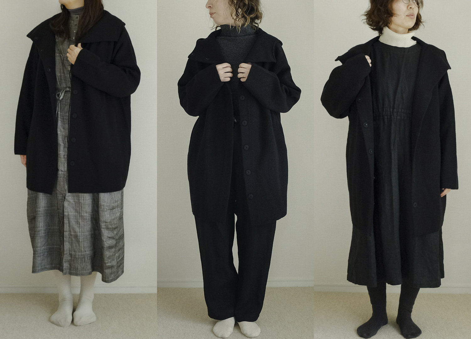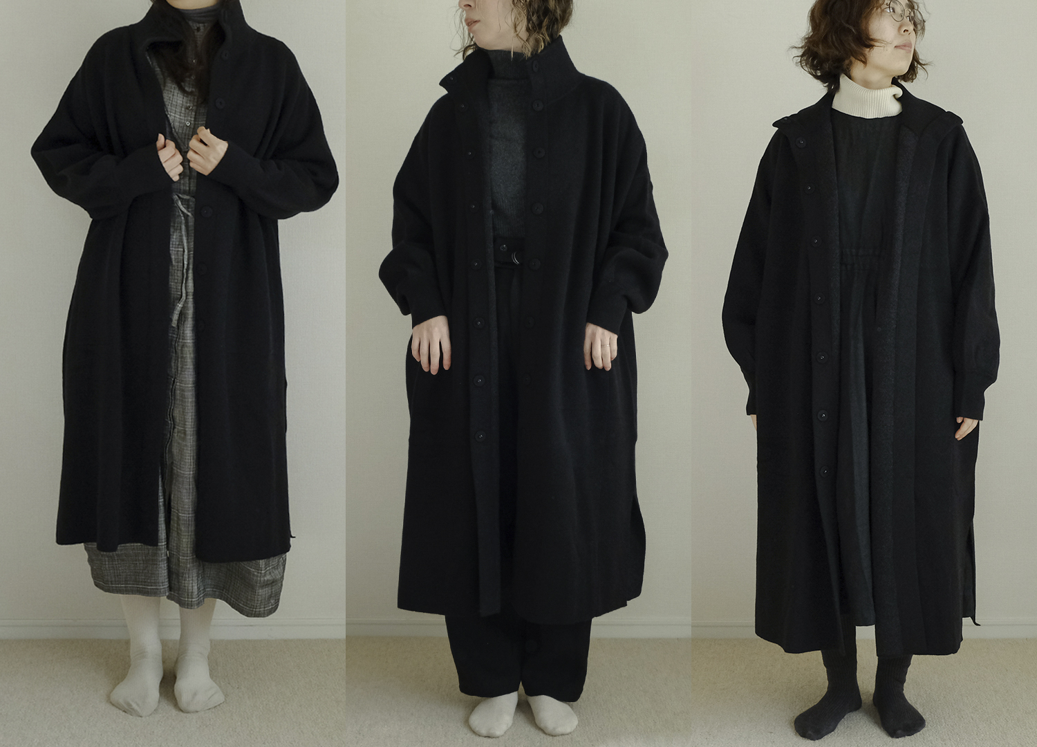 今回、軽やかなミドル丈から全身あたたかいロング丈までフリーサイズの3つのコートをスタッフが着用しました。