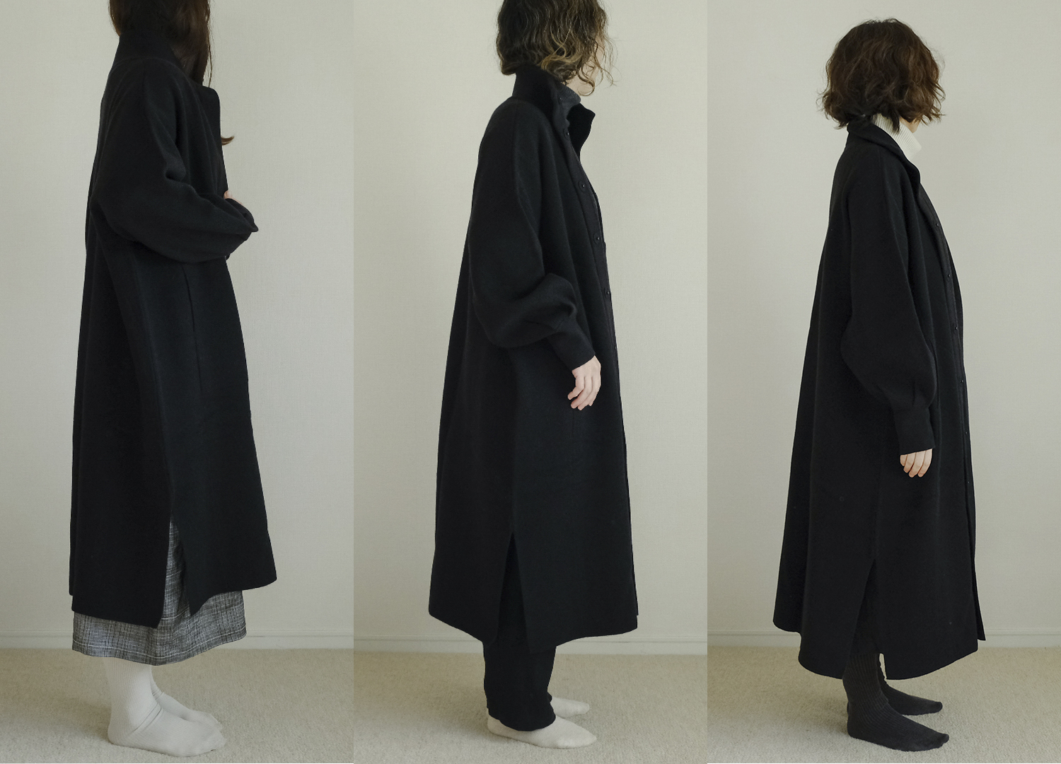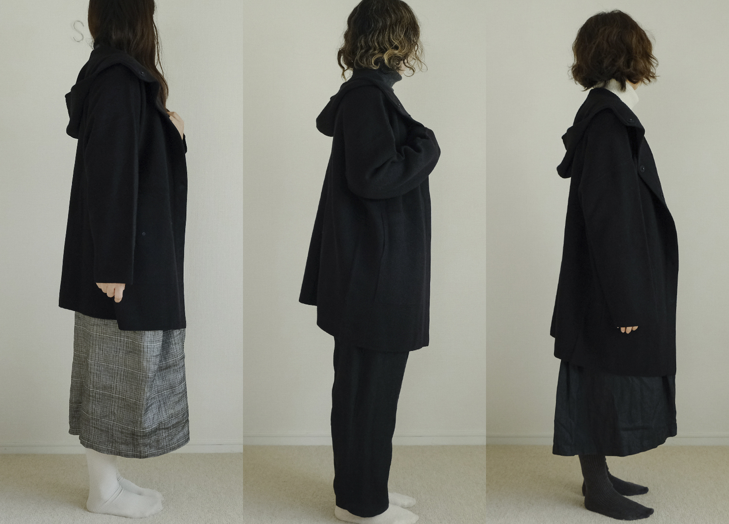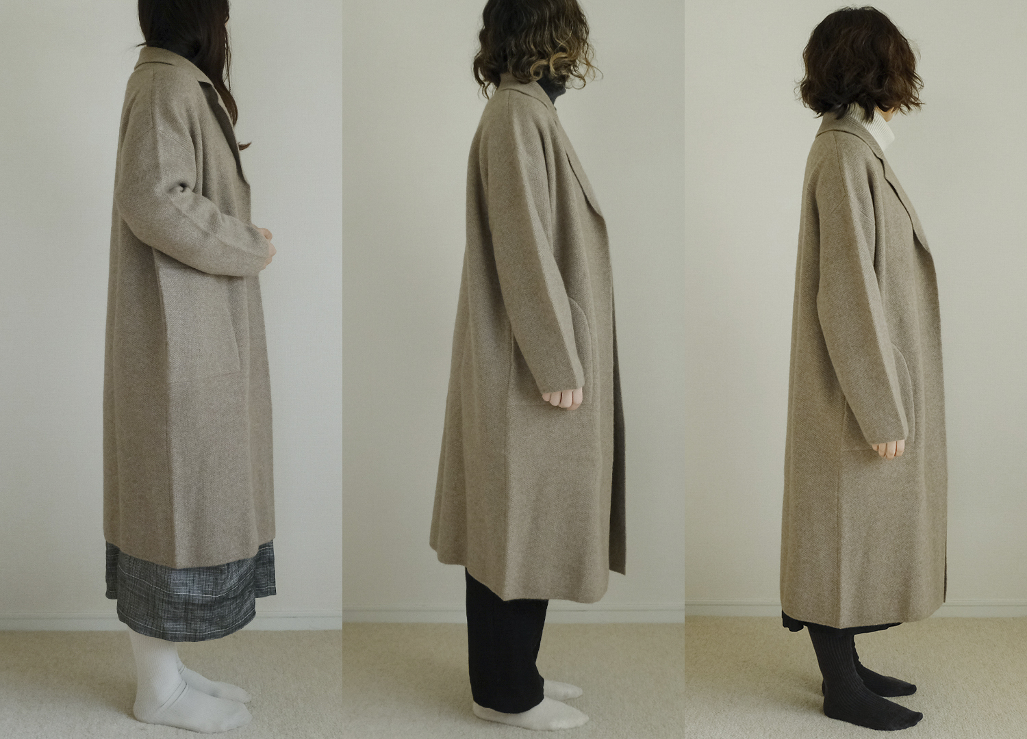 今回、軽やかなミドル丈から全身あたたかいロング丈までフリーサイズの3つのコートをスタッフが着用しました。