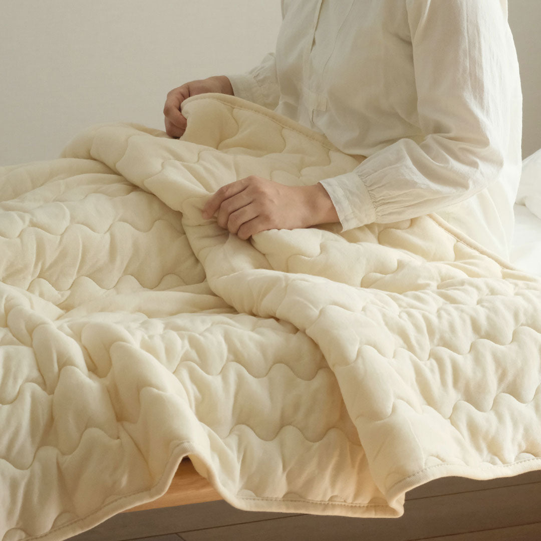 約900gの軽さでありながら、目が詰まっていて頬ずりしたいほどなめらかな肌あたりの毛布。ごわつき感が一切なく夏も心地よく使えるため、通年使えます。グランド部分を同じウール素材でつくっているのでとても軽く、フィット性の高い一枚です。