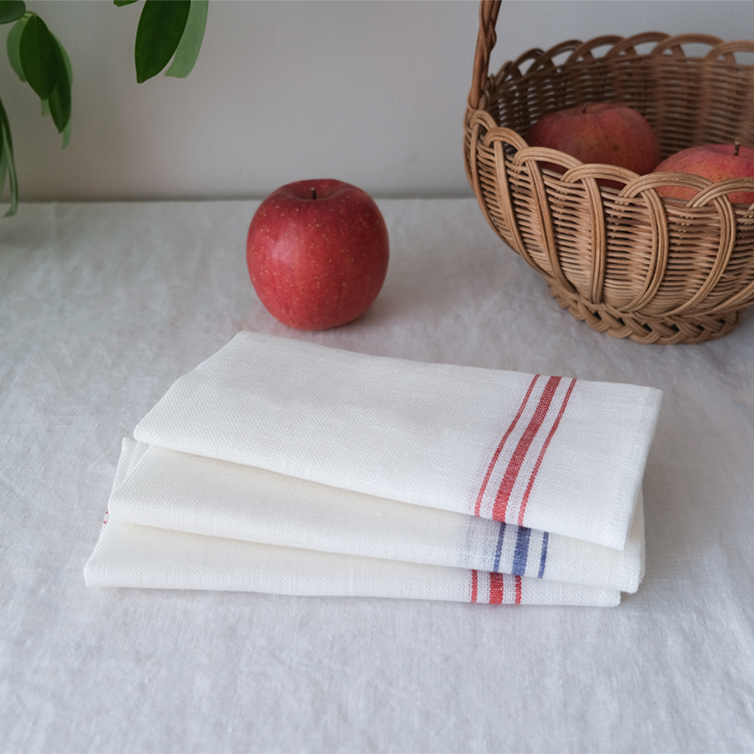 「ナプキン、お手拭きとしてが多いですが、洗った野菜や食器の一時置きや拭うときにも使っています。丈夫で乾きがよいので気軽に使えて、見た目もかわいいので数々の友人にプレゼントしてきました」