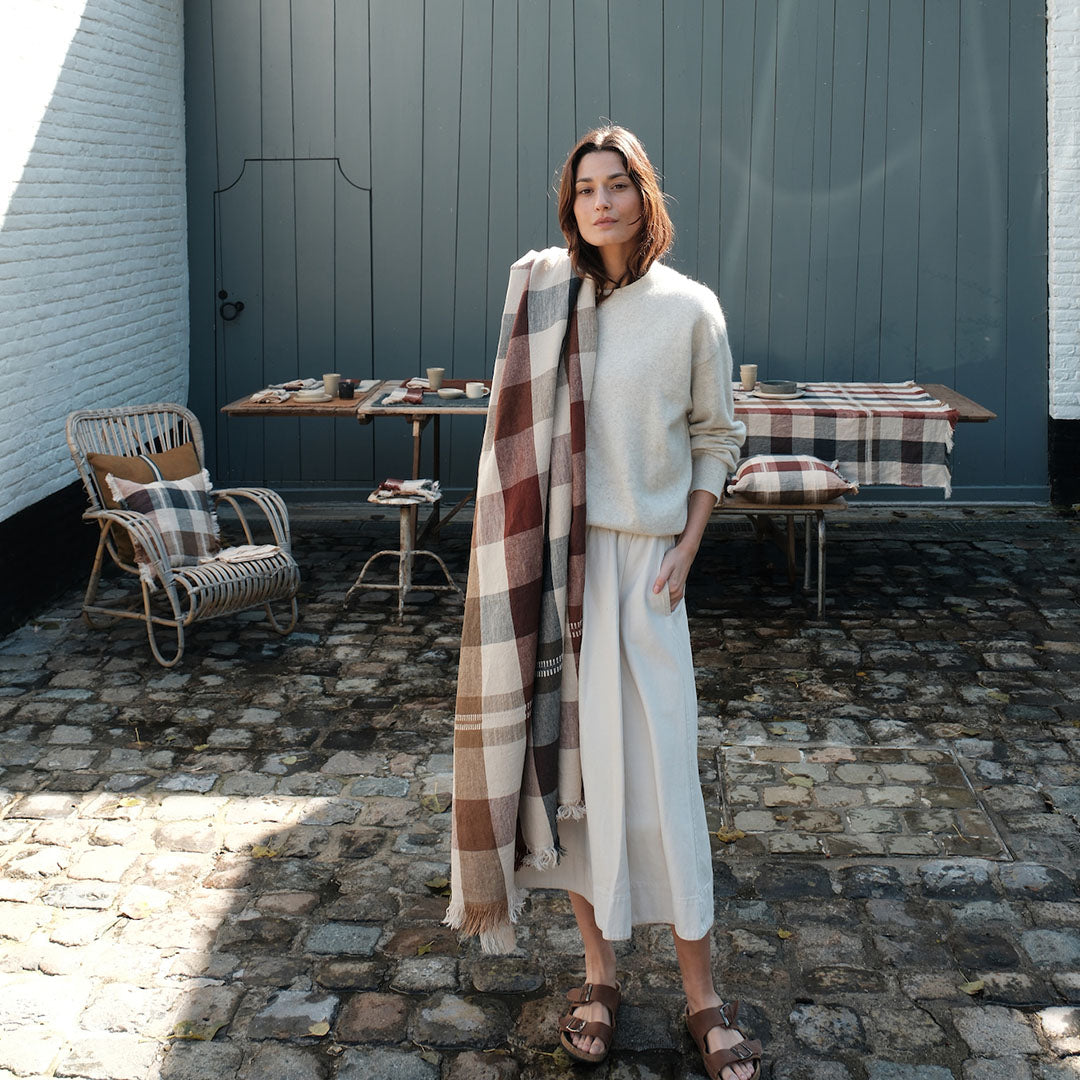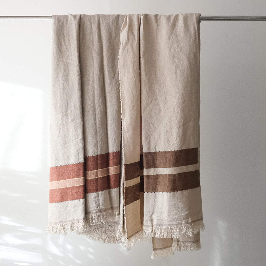 生地自体に私たちが惚れ込んで仕立てたオリジナルブランケットで、洗い込んだリネンの風合いやヘリンボーン織の豊かな表情など、ニュートラルなカラーで飽きのこない一枚です。