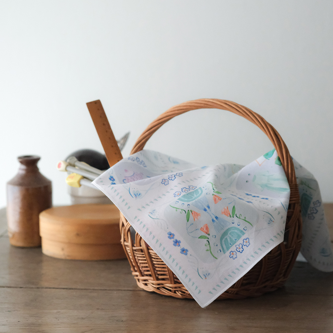 ハンカチとしてはもちろん、目隠しにしたり、お弁当を包んだり、スカーフのように鞄に巻き付けたり。日常にふと目に入るとうれしい気持ちになる淡く華やかなイラストです。