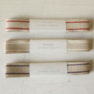 横糸と縦糸の色が違うので、ところどころ白いネップが見える、単色だけど表情のある生地。紐はテープにするとさらに簡単にできるうえにアクセントにもなります。今回は100%リネンでできたリボンテープ「ハンジ」のレッドを合わせることにしました。