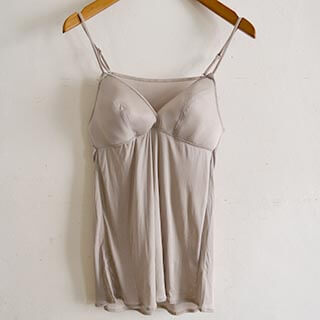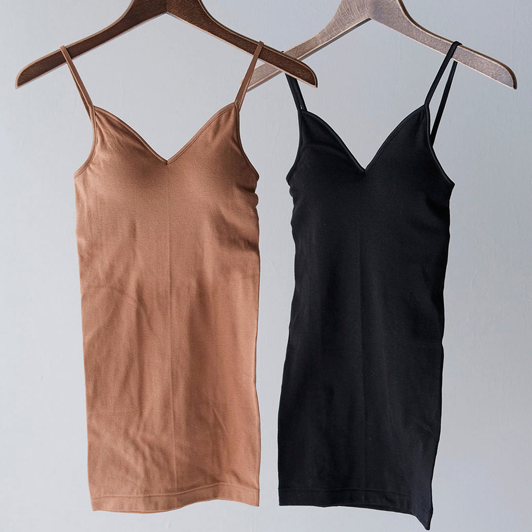 1枚でインナーとして完結するブラパッドキャミソールは夏の薄着になる場面でも、冬の重ね着が多くなる時期にも重宝する一枚。胸下にはゴムが入っていますが、締め付けはとても優しく、リラックスして着られます。