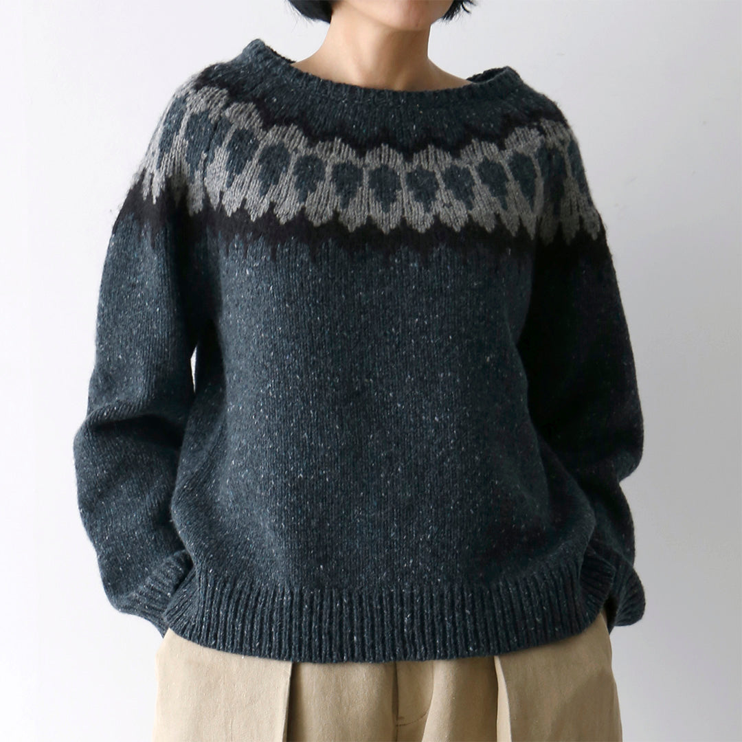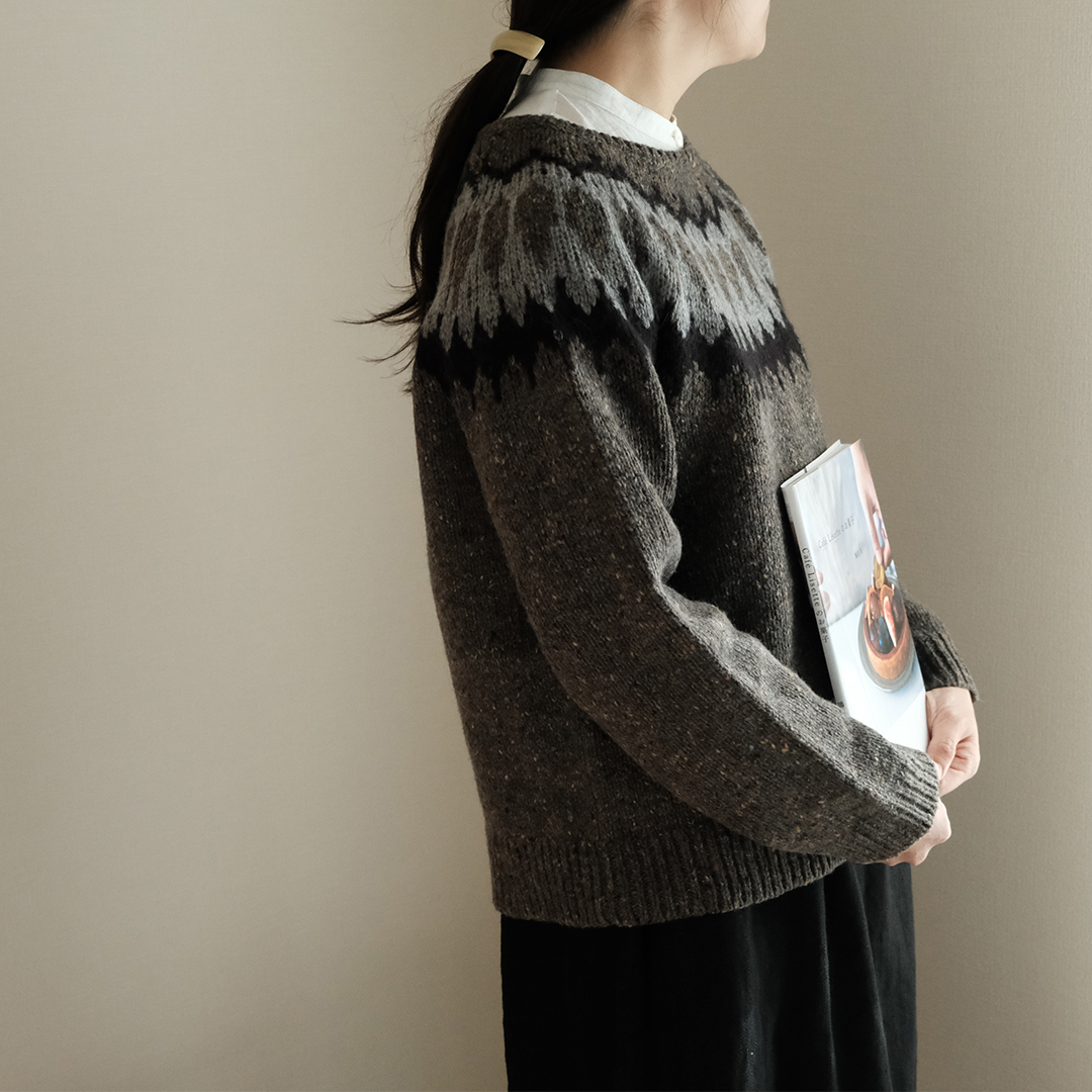 遠くから引いて見た様子もすてきですが、近くに寄ってもきゅんとしてしまう上質なセーターだと思います。