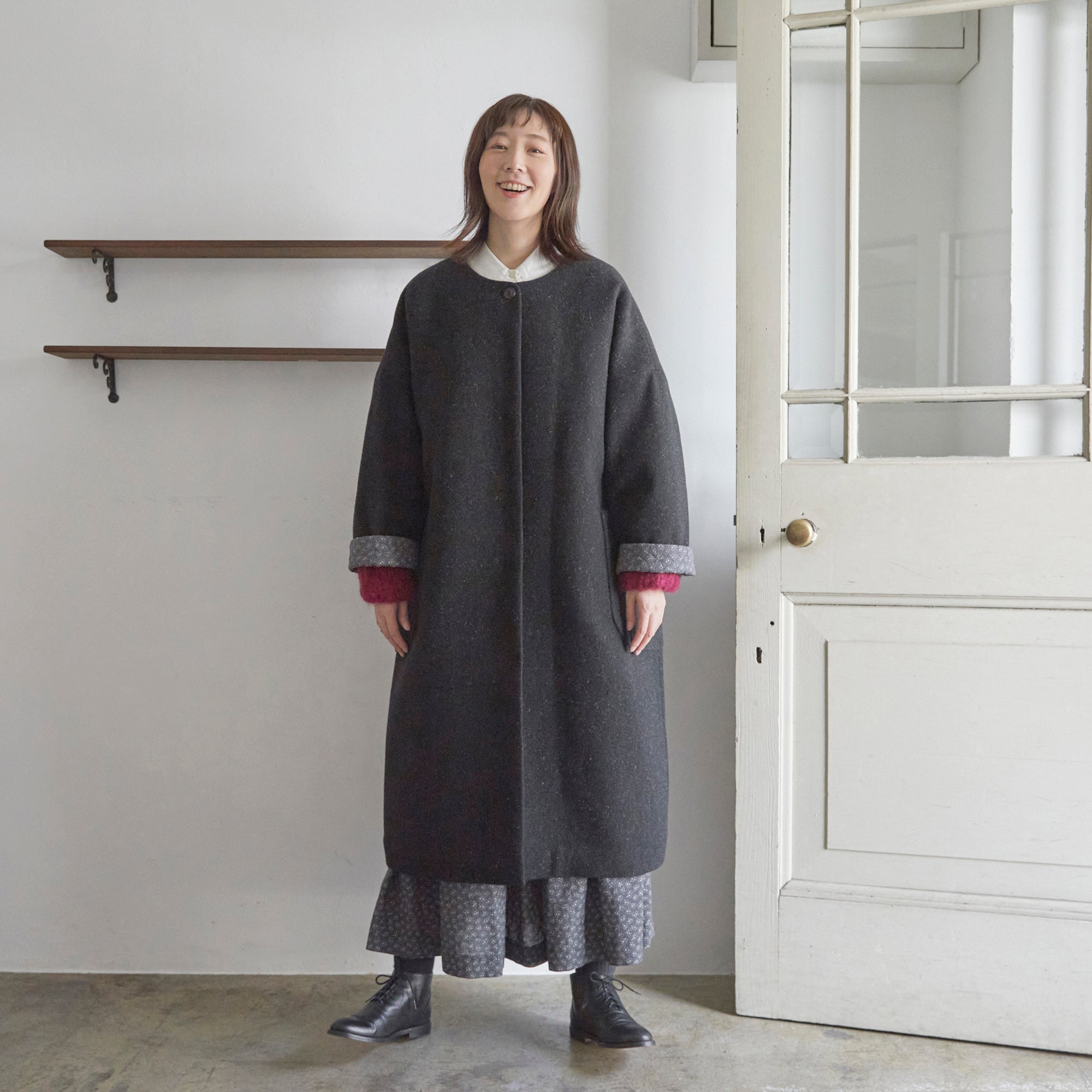表で着るときは袖口を少し折って、プラタナスの実の柄をさりげなく覗かせて。裏を出して着るときは少しカジュアルに「今日はコートが主役」という気分で楽しんでいます。
