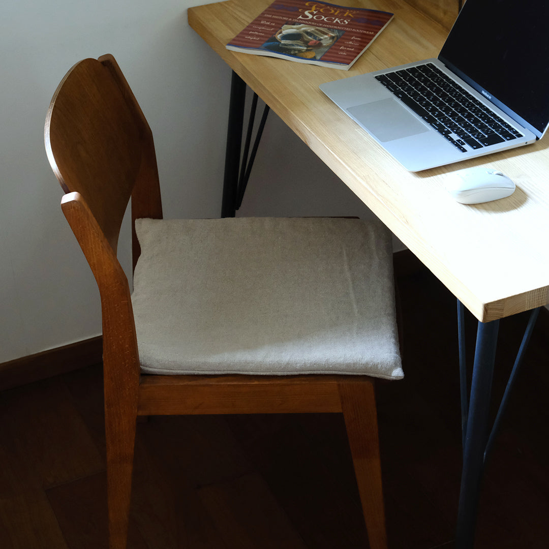 「夫がもし使わなければ自分で使おうと思ってましたが、座面が木の板の椅子に合わせて、夫が一日中使用しています。薄いので椅子との一体感がありそうだったところも選んだポイント。毎日使用して半年以上経つのですが、へたった様子もないです」