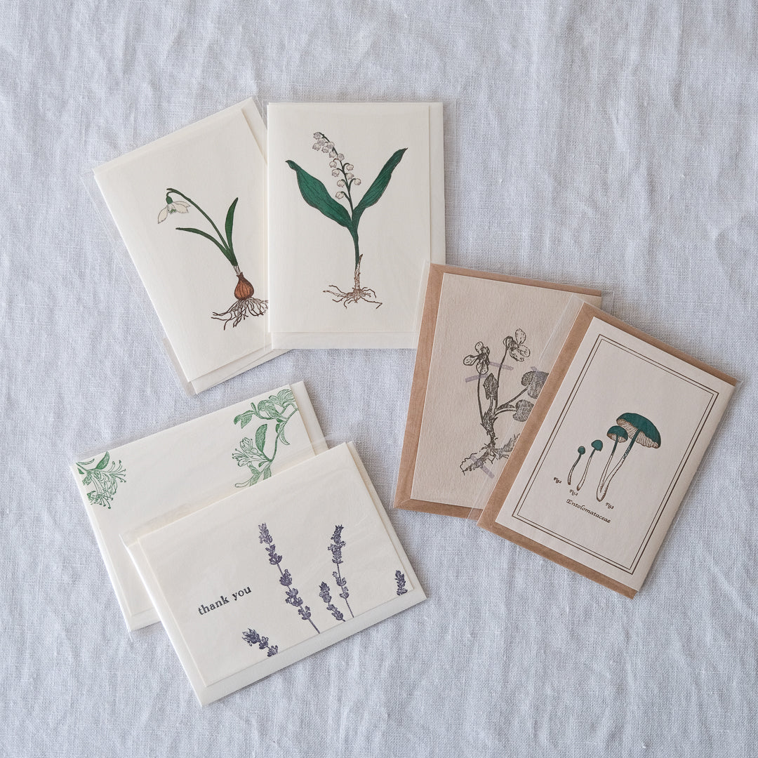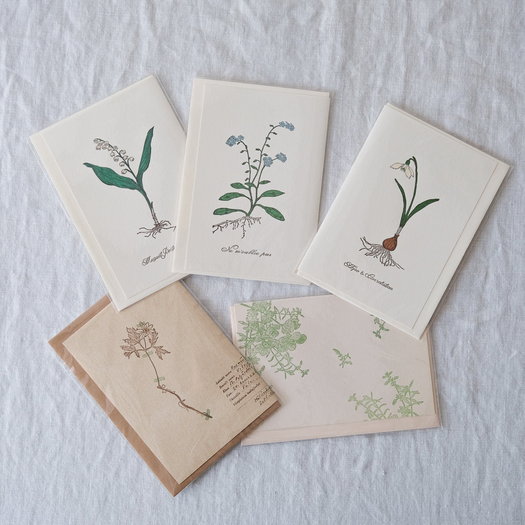 身近な植物を紙の上に咲かせるbotaniko pressのカード。それらはすべて小さな活版印刷機で手差しで印刷されています。