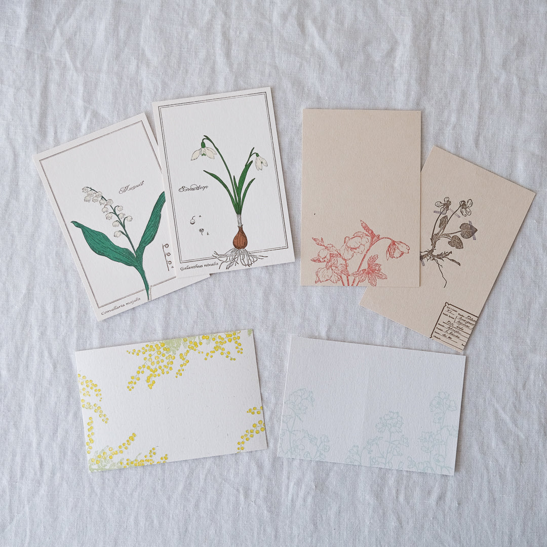 庭先や散歩道など、身の回りで季節を告げる植物が描かれたグリーティングカード。しばらく会っていない人へのごあいさつや、日常のちょっとした出来事の報告に。素直な気持ちで綴ることができるカードです。