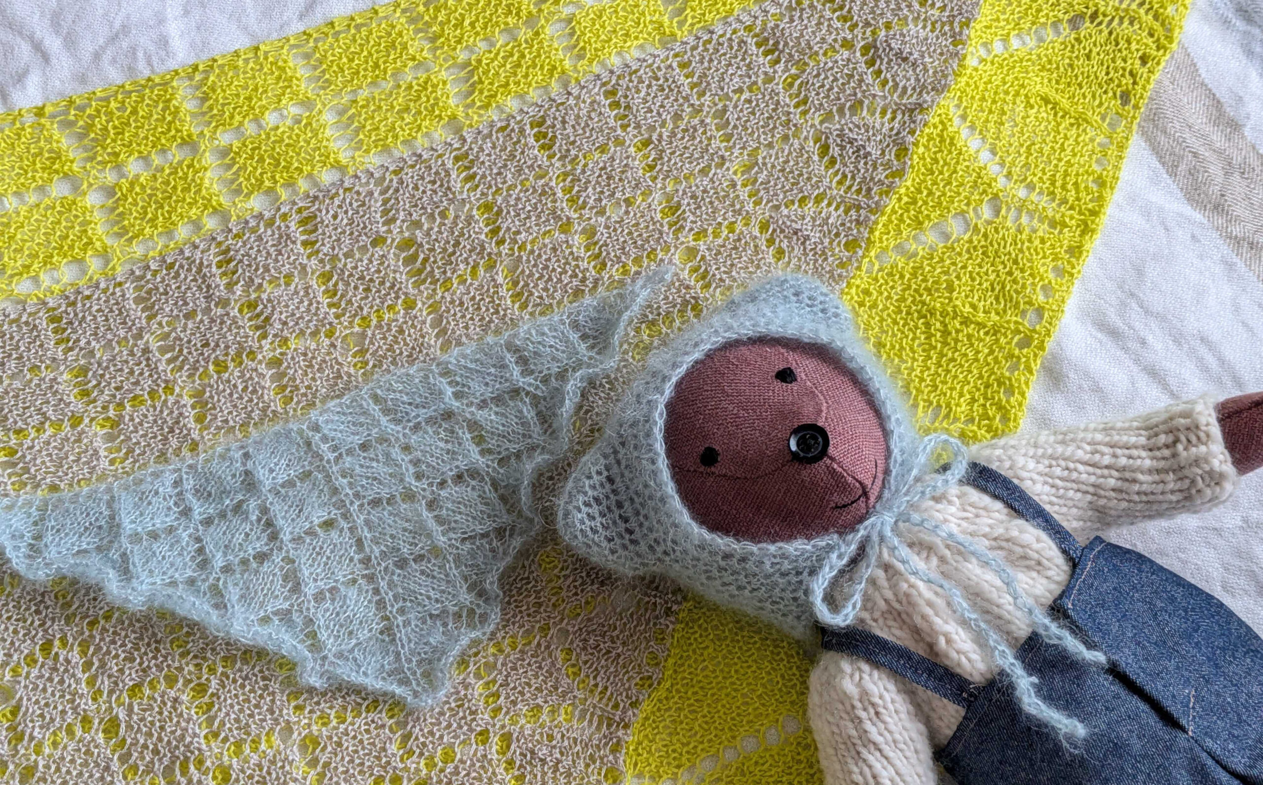 以前のものより細いリネン糸を選んだので、コンパクトなスカーフサイズに仕上がりました。