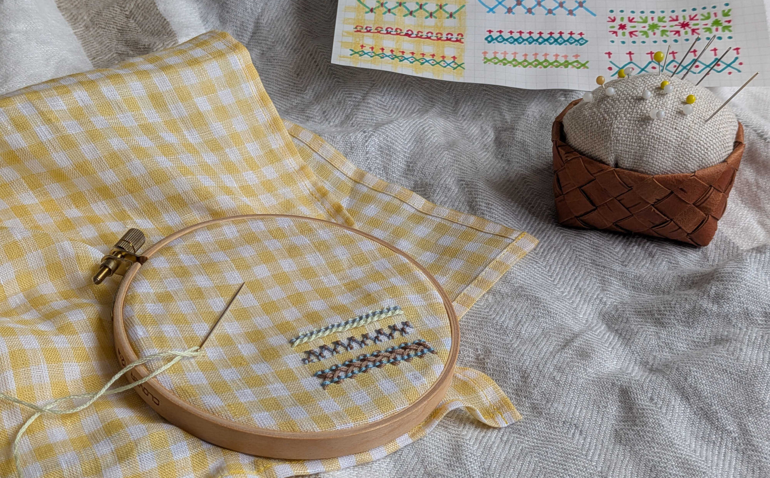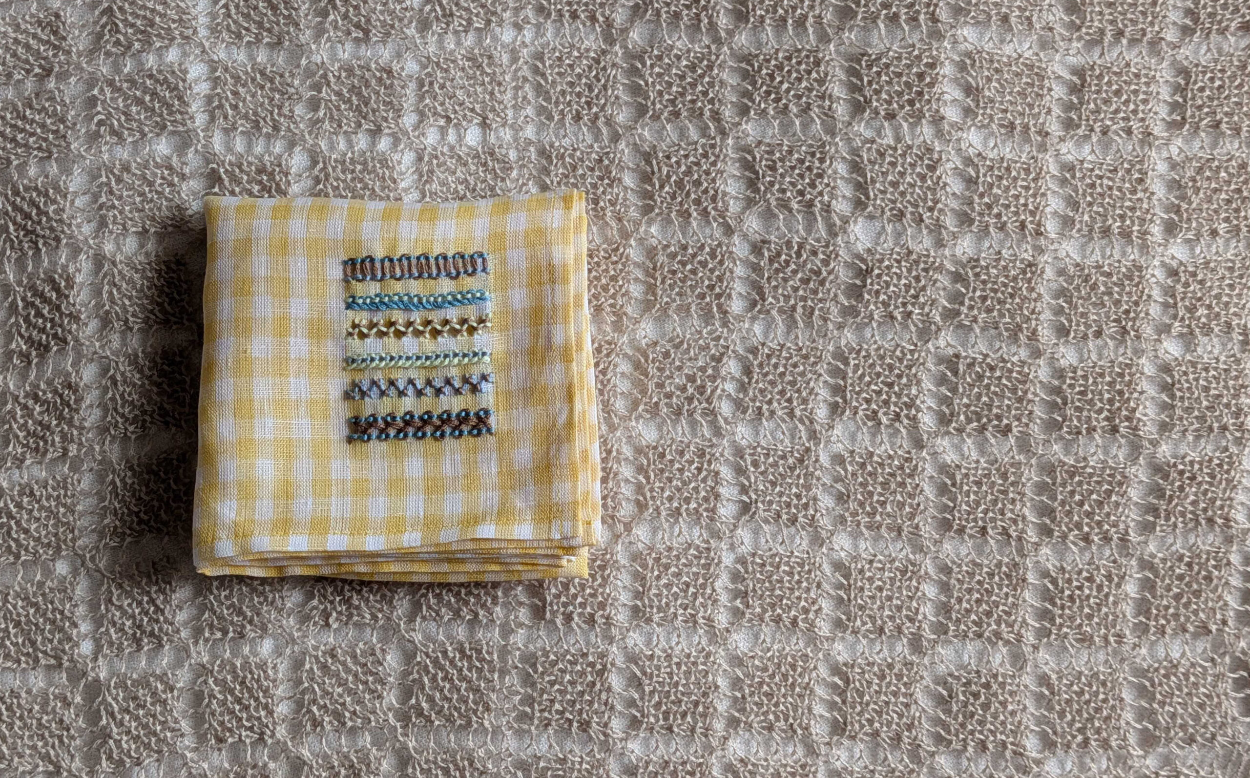 最近購入したTLB HOMEのハンカチに刺繍をしました。綺麗なイエローのギンガムチェックを見ていたら、ふいに刺繍をしたくなりまして。