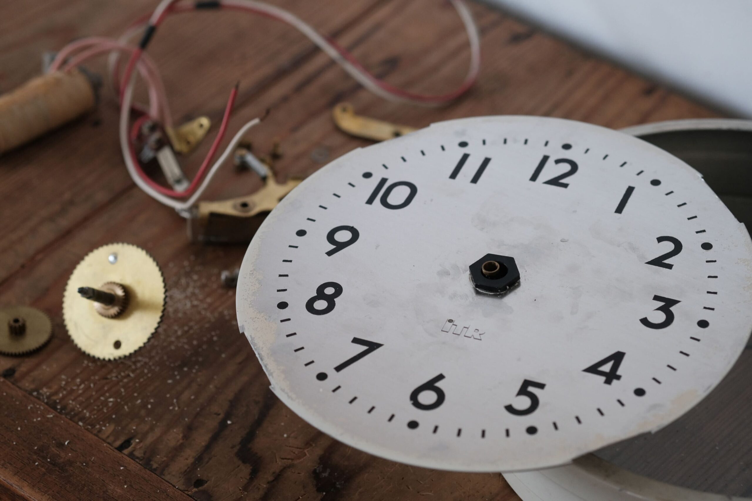 新しい針とムーブメントを何とかつけて、何度も何度も微調整を繰り返します。途中、(あんなに事前に調べたのに)針と時計のカバーがどうしてもぶつかってしまうので、えいやと針をハサミでカット。そうして何とか、きちんと動いてくれる壁掛け時計が完成しました。