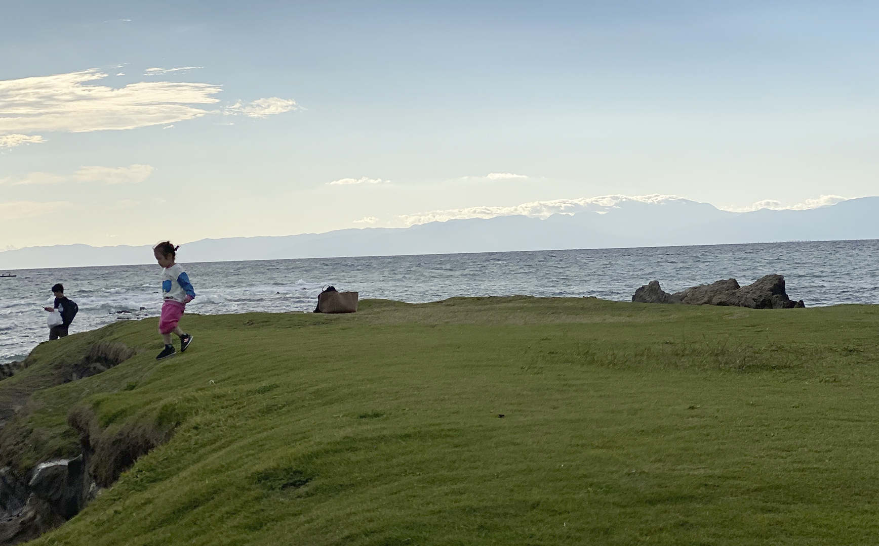 展示を観た後は裏手の一色海岸へ。砂浜を進んでいくと岩場があり、まるで海外風(?)の景色が広がります。