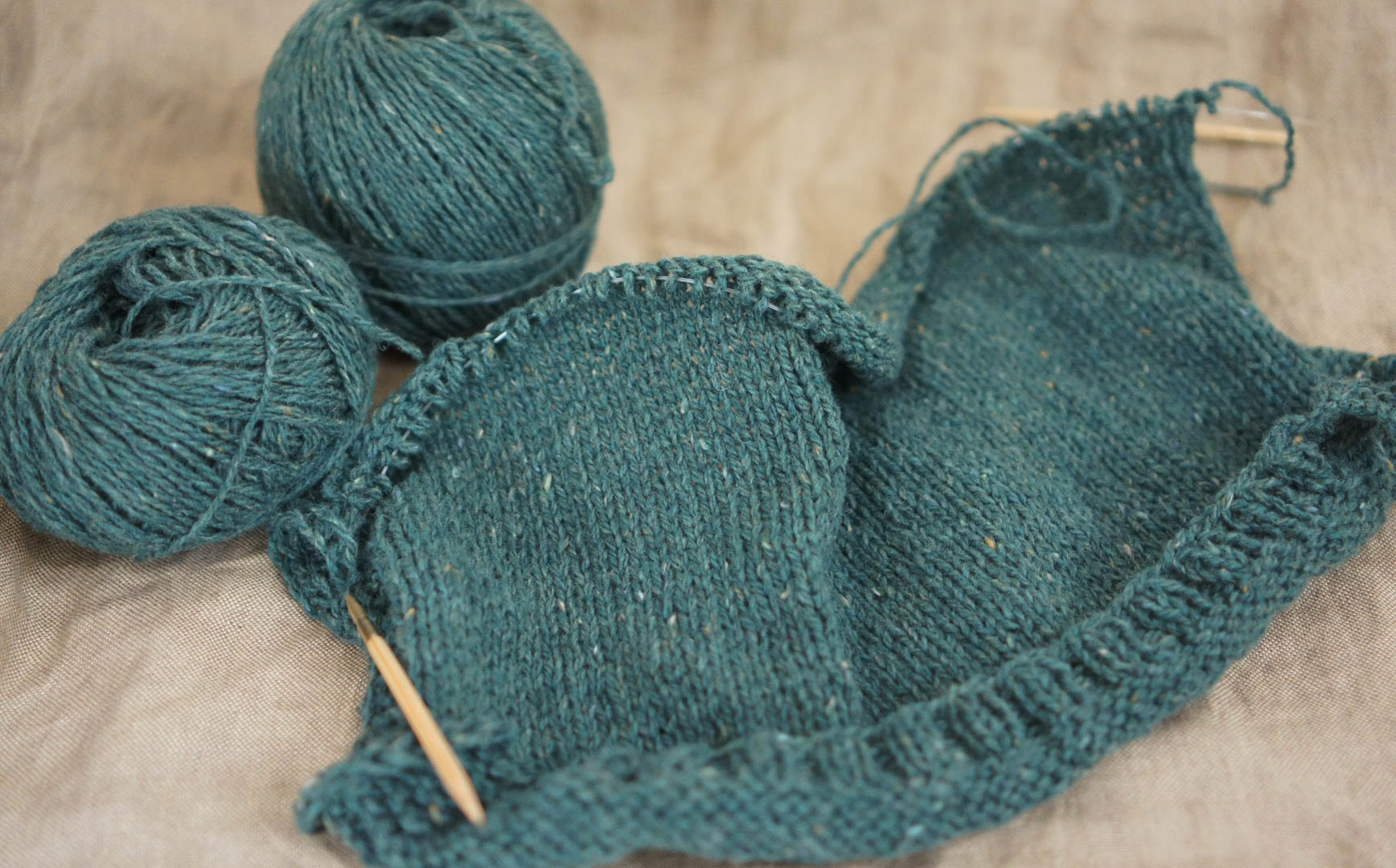きちんとゲージを測ったはずなのに、いざ編んでみるとサイズが小さくなってしまい、前身頃を解くこと2回。ただいま3回目を編んでいます。