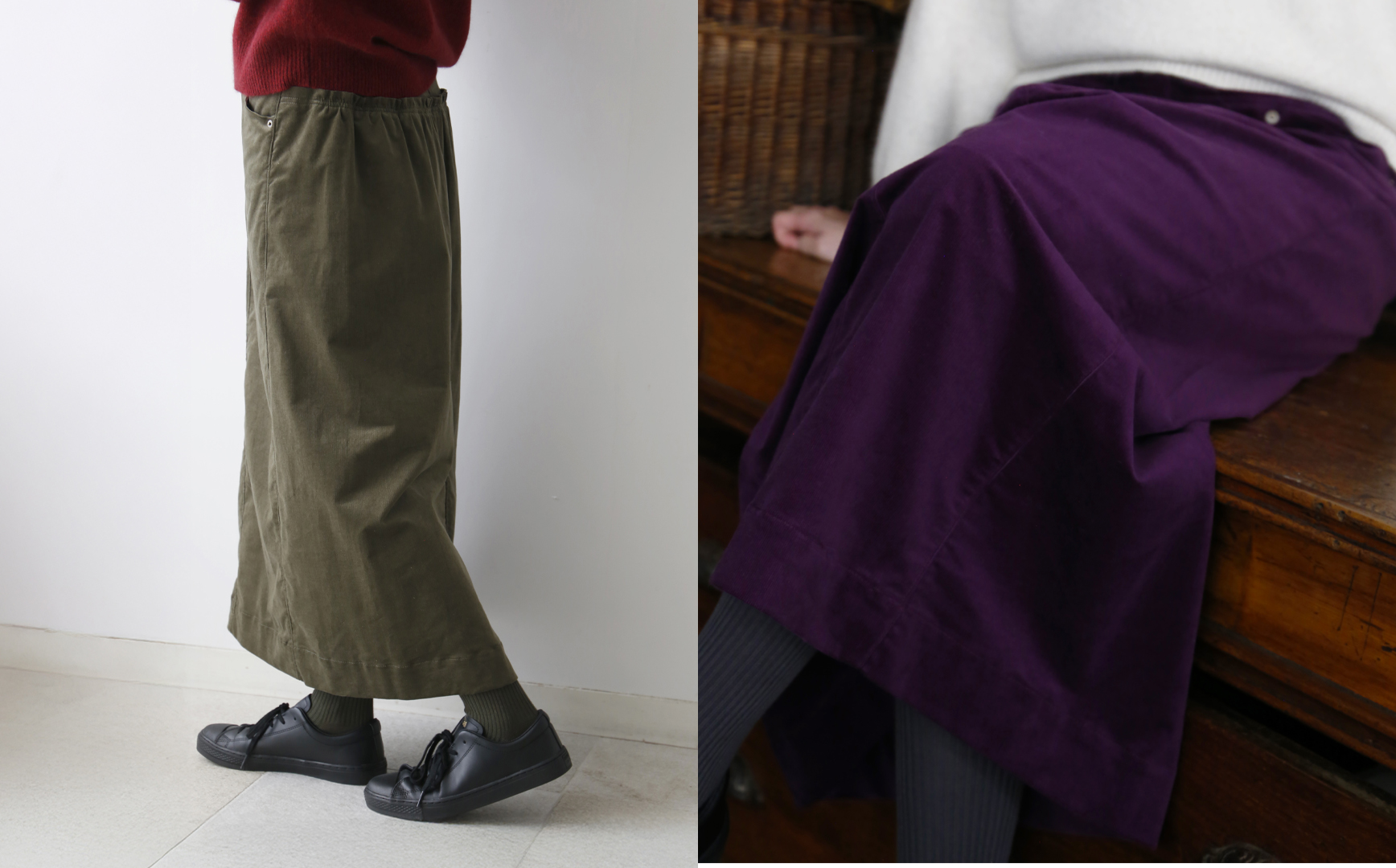極細畝のコーデュロイで仕立てたスカート「マルゴ」。あたたかみがありながらも軽やかで、冬を越えて春先まで、季節をまたいで楽しめる一枚です。