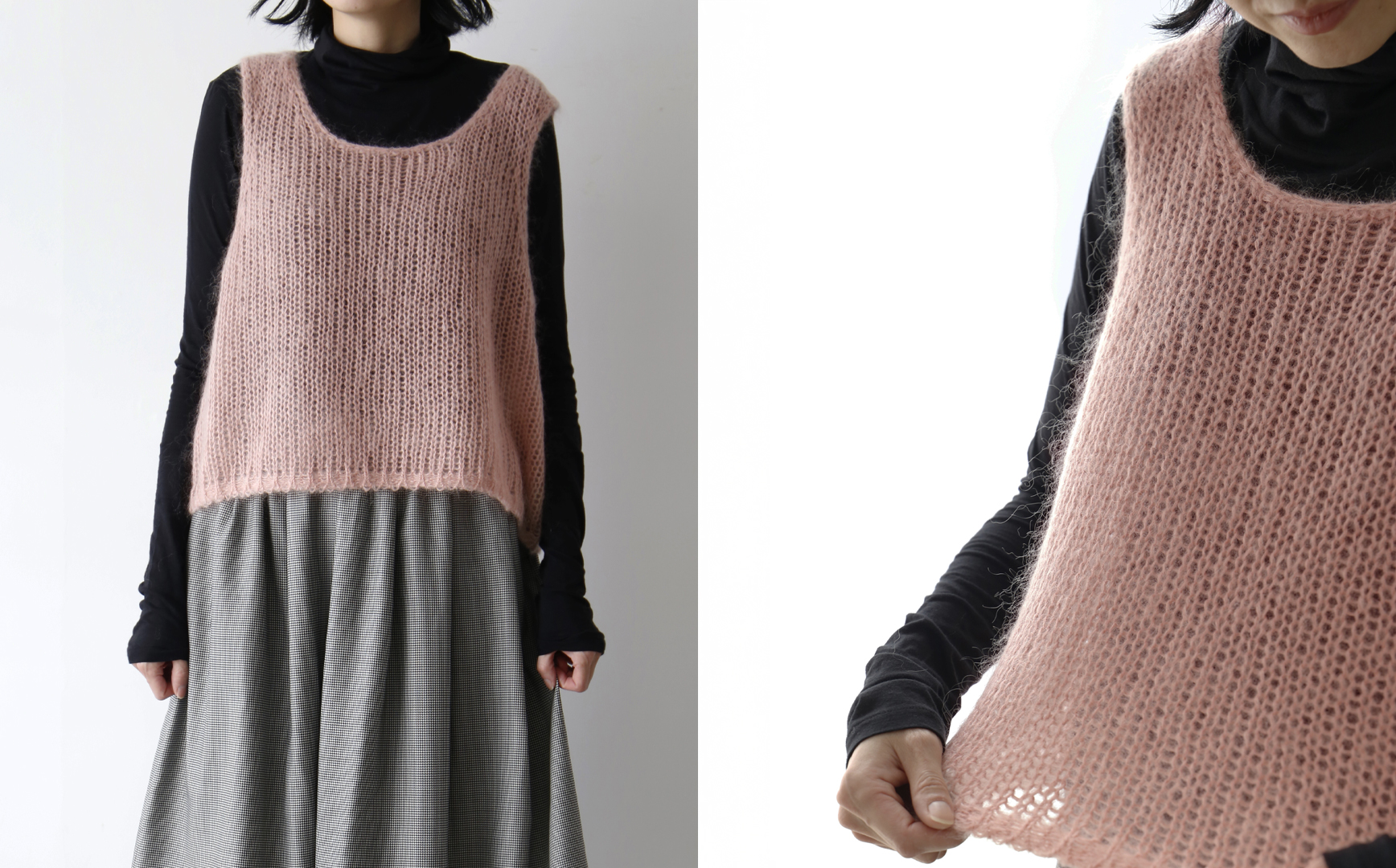 空気を含んだような軽さが魅力の、キッドモヘヤのベスト「ミュー」。寒い時季は重ね着に、春先には装いのアクセントとして。