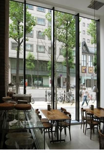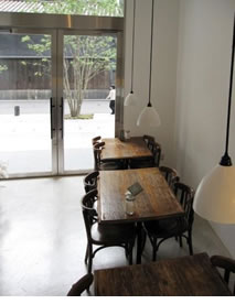 お隣りのリネンバード同様、カフェも天井が高くて気持ちのよい空間。 こちらは、堺筋側の大きなガラス窓。街行く人たちを眺めながらゆっくりティータイムもよさそう。