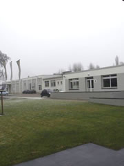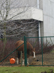 霧が多いフランダース地方の冬。工場を訪れたこの日もやはり、街はもやがかかり幻想的な雰囲気。 たちこめる霧のむこうに、平たいホワイトグレーの工場がたたずんでいました。 (写真)工場の近くには、鹿や馬が。私たちを迎えてくれました |