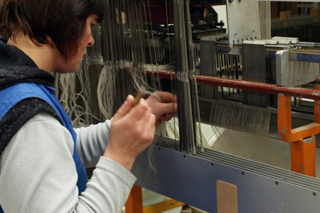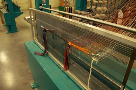 | 約200人が働くリベコの工場。3交代制で、24時間フル稼動しているそうです。 まず案内してもらったのが、整経作業をする部屋。 イタリアなどで紡がれた糸を織物にするために、必要な長さの縦糸を必要な本数分準備していきます。 |
