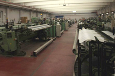 | 整経された縦糸は、織り機がずらりと並ぶ部屋で製織。ちょうどローマやサルディニアなどを織っている様子を見ることができました。 糸切れなどがあった場合は、機械がストップ。トラブルを知らせるランプが点 灯すると、すぐさまスタッフが駆けつけて不具合があった箇所を発見、修正し ます。その手際の良さといったら!優秀な機械も、人の経験や勘にはかなわな い気がします。 |