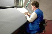 | その後、生地のしわをのばして、鋭い刃で表面の毛羽をシェービングし、近くのフィニッシャーへ。 染色などの最終加工を施します。戻ってきたものを再び補正して、あとは出荷の時を待つばかりです。 |