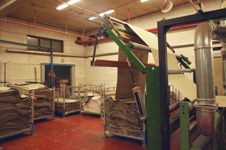 | 織り上がった生地は、人の手によって繕います。 これはフラックスならではの手間だそうです。 握りバサミでネップをカットしたり、霧吹きをかけて汚れを取ったり、織りの際に混ざってしまった繊維を針でとったり…。 数人のスタッフが裏からライトをあてた生地を上から下に流しながら、問題がないか真剣に調べていました。 (写真上)細かい補整の作業は、人の手が頼り (写真下)シェービングをする機械。とった毛羽は袋にたまるように。 |