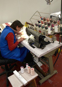 | (写真左)取り出しやすいよう並べられたストック。ここから、出荷されていきます。(写真右)新商品の縫製をしているところが見られました |