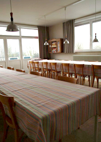 | (写真左)玄関には1878年製の織り機やフラックスの束、1950年ごろのフランダースの畑の写真パネルなどが展示 (写真右)長いテーブルに、テーブルクロスがぴしっとかけられた食堂(食事づくりのおばさんが来る日ではなかったので、残念ながらランチをとることはできませんでした) |