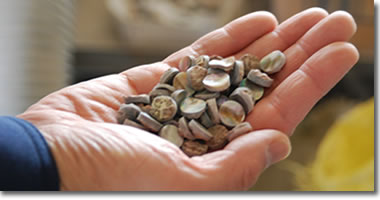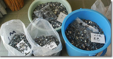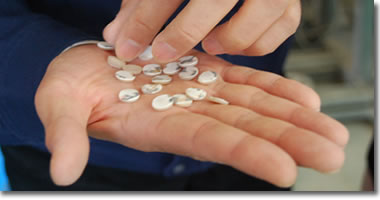 | 最初は裏側が黒かったり、凹凸があったり、貝の原型をかなりとどめている状態です。これを機械で削り、厚みをそろえて平らにします。