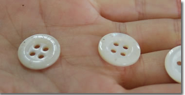 | 貝からまさにくりぬいた状態のボタン。片面がゴツゴツしています。