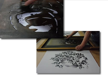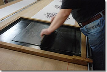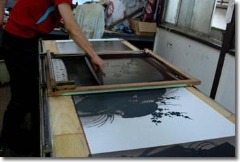 微妙なタッチが必要なところは、刷毛で作業。 これは、スケージを使わない「ぼかし」。 墨で一息に描いたような線を、型紙と刷毛を使いながら見事に再現していきます。 刷毛をくるくる回して絵を描くような感覚で塗っていき、 さらにもう一度同じ色を重ねることで、筆だまりのような部分ができ、 まさに手描きに近い感じを表現していきます。 |