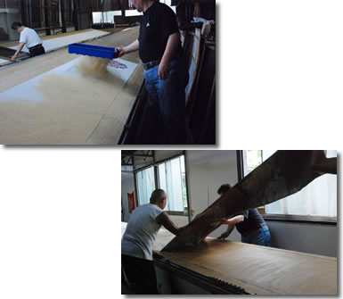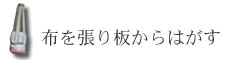 染料が乾かないうちに作業するので、汚れないよう全体におがくずを たっぷりまぶし、張り板からはがします。 「桜や松など、アクの出るおがくずはダメなんです。 つがの木がいいんですよ。 ただ、最近はおがくずも貴重になってきていて「くず」じゃなくなって ますけどね(笑)」。 |