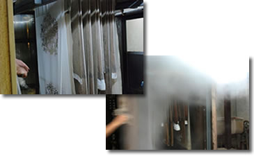 95〜96℃で蒸します。布の厚みや色の塗り重ね具合などによって 違いますが、だいたい20分。「染料が乾かないうちに蒸すと、 発色がよくなるんです。これがうちの特色」。 蒸さずに染色だけしても、水で洗ってしまうと色はほとんど定着しません。 実はとても大切な作業。 |