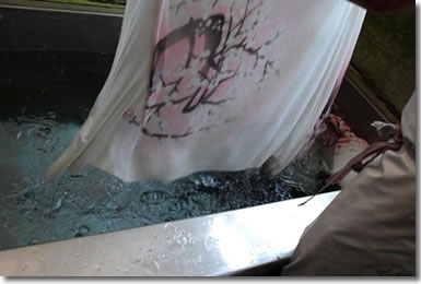 蒸し終わったら、水の中でのりを落としていきます。黒く塗りつぶされていた部分が、みるみる洗い流されて美しい色と絵柄が現れました。 こんなに複雑な模様、こんなにたくさんの色が使われていたなんて改めてびっくりです。 「以前はこの作業を川でやっていたんですよ。水質汚染?とんでもない。 だってのりの原料はもち粉とぬかですよ!昔はこの作業をやってると、 魚が寄ってきたっていわれてるくらいです(笑)」。 こののち、脱水、乾燥してひとつひとつを丁寧に検品したところで納品。 その後、別の工場で裁断され、端ミシンをかけて風呂敷としてようやく完成します。 |