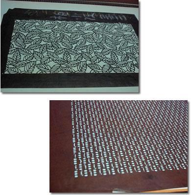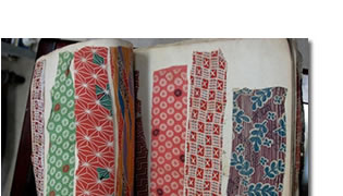 | 最後に、萩原さんの家に古くから伝わる小紋の型や昔の江戸更紗の そのモチーフは花や葉などの自然、鹿やきつねなどの動物から幾何学模様など。 どれも繊細かつ大胆に美しい連続模様として連ねられ、それはもう見事。 昔の人のセンスに脱帽でした。 現代を生きる私たちが見ても、洋服やインテリアにすぐに使ってみたい!と思うものばかりです。 「これをどう生かすかですか? それは子供たちの世代がどうするかでしょう?」と、 笑う萩原さん。 去年から息子さんが工房に入って染色の仕事を手伝い始め、 娘さんも将来はお父さんの仕事を手伝いたい、と話しているとか。 風呂敷の需要はなかなか伸びないそうですが、代々伝わる染色の手法やすばらしいデザインをうまく生かすステキなアイディアが生まれるといいですね。 |