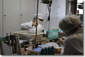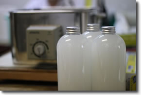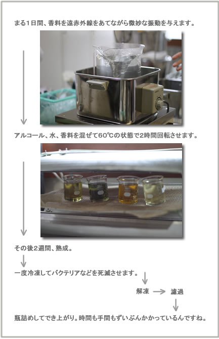 | 「それで結局、昔ながらの方法に立ち返ることにしました」。 使ったのは天然(石油などを使っていない)のアルコール。 「化粧品作りではアルコールは使わないようにしていますが、リネンウォーターなら、アイロンをかけるときに熱で蒸発するでしょう。殺菌効果もあるし、いいんじゃないかと思って」。 そして今度はアルコールを使ってこれまた試作の繰り返し。結局500kg(!)ものアルコールを使ってようやく完成したのです。 ここまでなんと約8ヶ月。 ひたすらでき上がるのを待つばかりのリネンバード側では、そんなご苦労があったとはつゆ知らず、ただただ「まだかなあ」と待ち続けていたのでした。宮崎さん、本当に申し訳ありませんでした! |