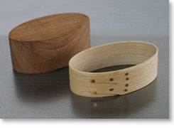 シェーカーボックスには決まった大きさがあり、今、井藤さんが作っているのは12種類。 ところが、今回依頼したピンクッションは円形が直径5.5cm、楕円が長径7cmと、それらとは比べものにならないほど小さなものです。 「ピンクッションは小さくてカーブがとても急なので、最初、通常使うチェリー(桜)で作ってみたら、割れてしまったりしたんです」。そこで、より緻密で水分を含みやすいメイプルで作ることにしました。 「でも、やっぱり曲げるのには苦労するんです。特に楕円より円形が難しいですね」。 |