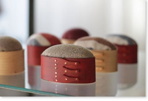 | よい木材選びが、シェーカーボックス作りのとても重要な部分なのだとか。 「すべて木目で決まるんです。木目がきれいじゃないと、型にはめて乾燥しても、あとで変形したり割れたりしてしまうことがあって。素直で欠点のない木目の材を選べば、そんなことは起こりません。いかにいい木を手配できるかが、まずはとても大切なんです」。 小さくても作り方にひとつも変わりはなく、そのミニチュアっぽさがかわいらしいピンクッション。 リネンの針山部分は、リネンバードでひとつひとつ手作りしていますが、その風合いともよく合っています。 |